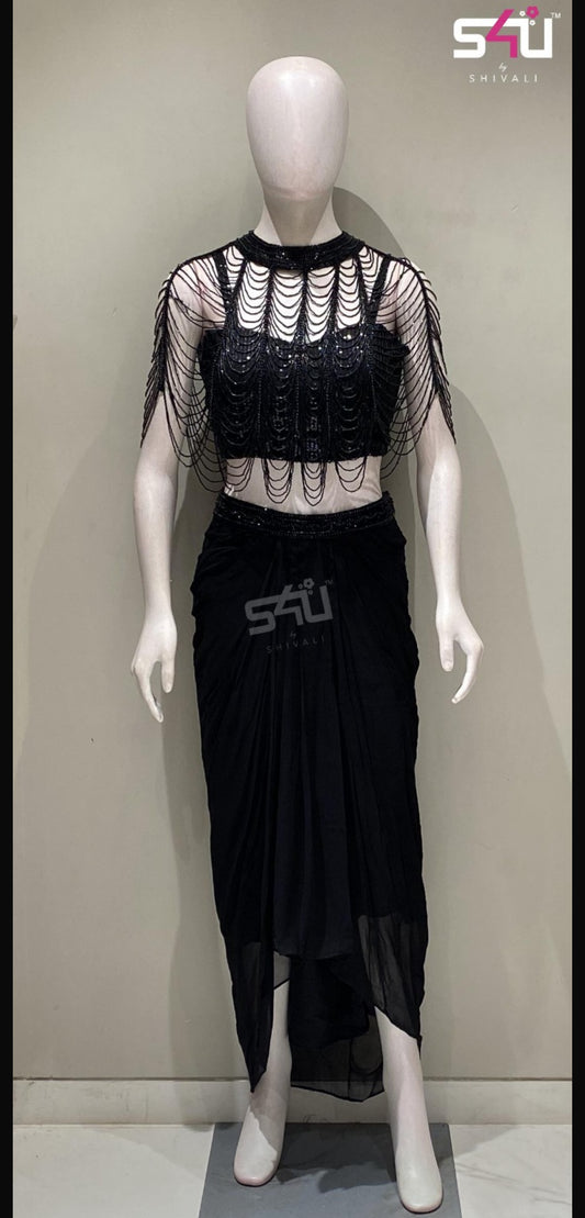 Beautiful designer Black Cape Tulle Embroidered Sequins Cape Open Wave Draped Skirt Set