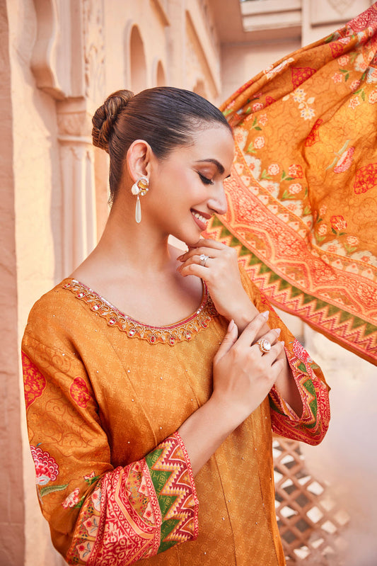 Beautiful designer Orange Traditional Printed Spanish Silk Anarkali Set