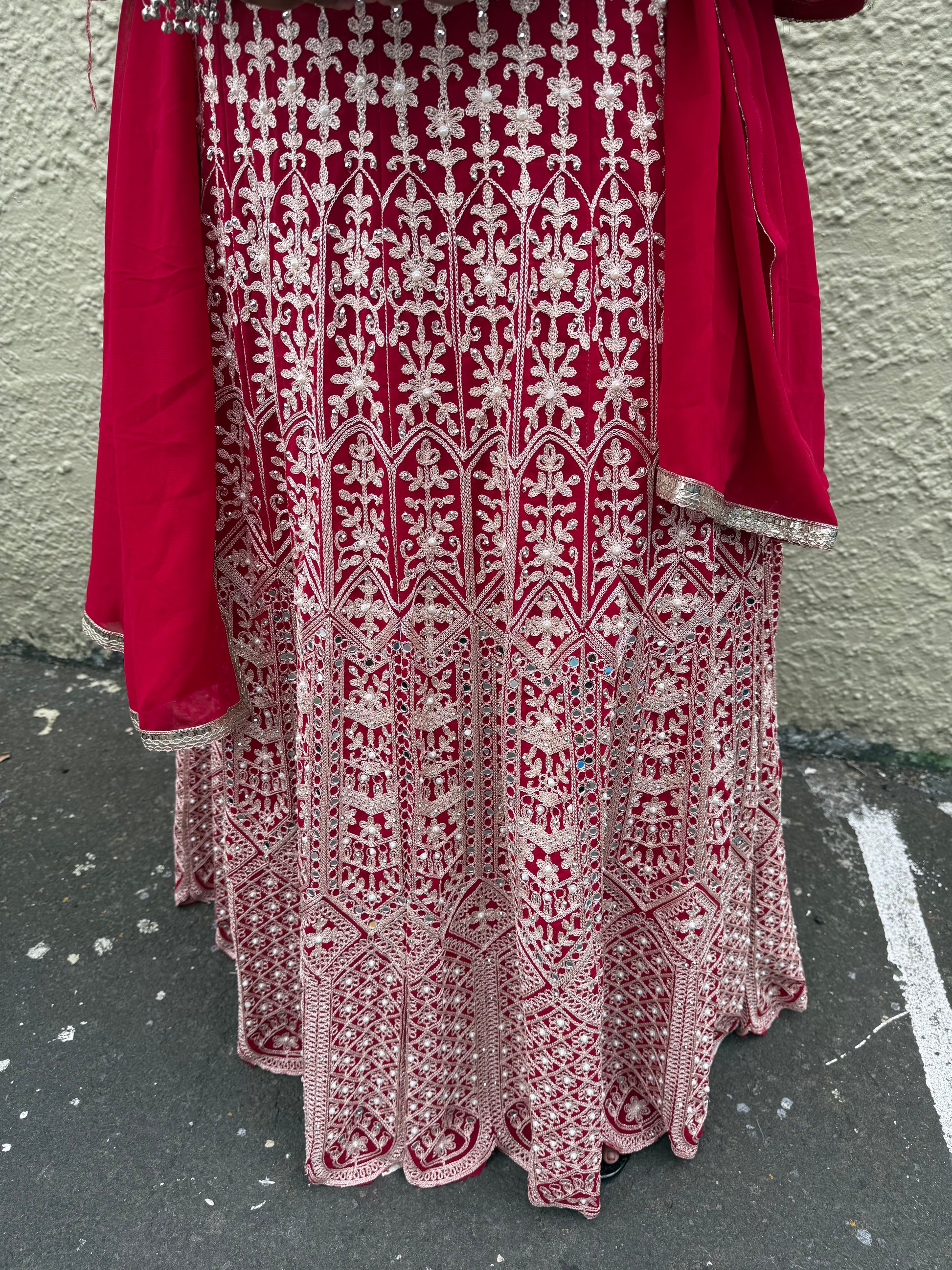This beautiful designer anarkali suit is made from high-quality fabric geogrette, providing luxurious and comfortable wear. The front and back feature exquisite embroidery, accented with delicate pearl and mirror work, adding a touch of elegance to the design. Experience the perfect combination of style and comfort with this anarkali suit.
