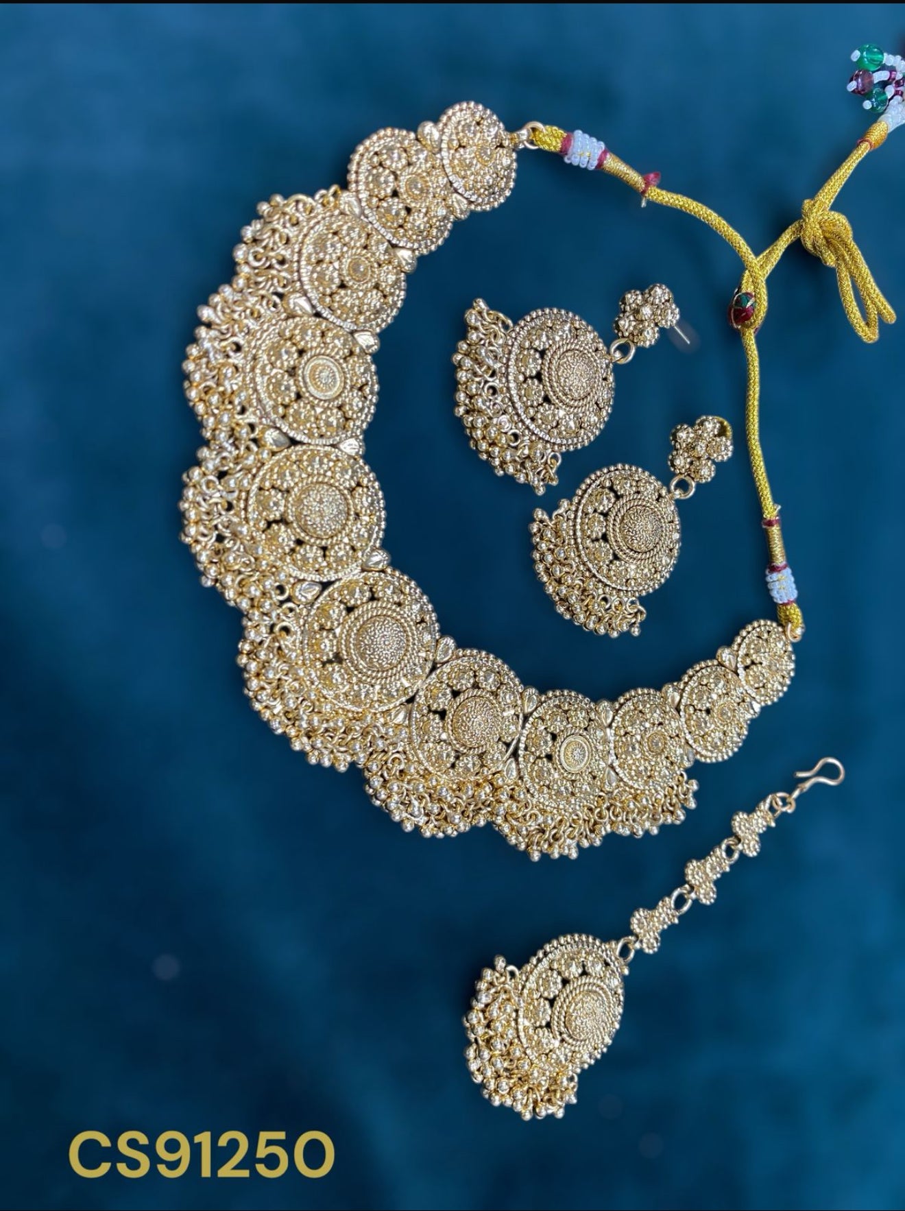 This beautiful designer gold plated necklace set features a one gram gold plated finish that gives it a real gold look. The set includes matching earrings and a tikka, making it the perfect accessory for any formal occasion. Elevate your style with this elegant and affordable set.