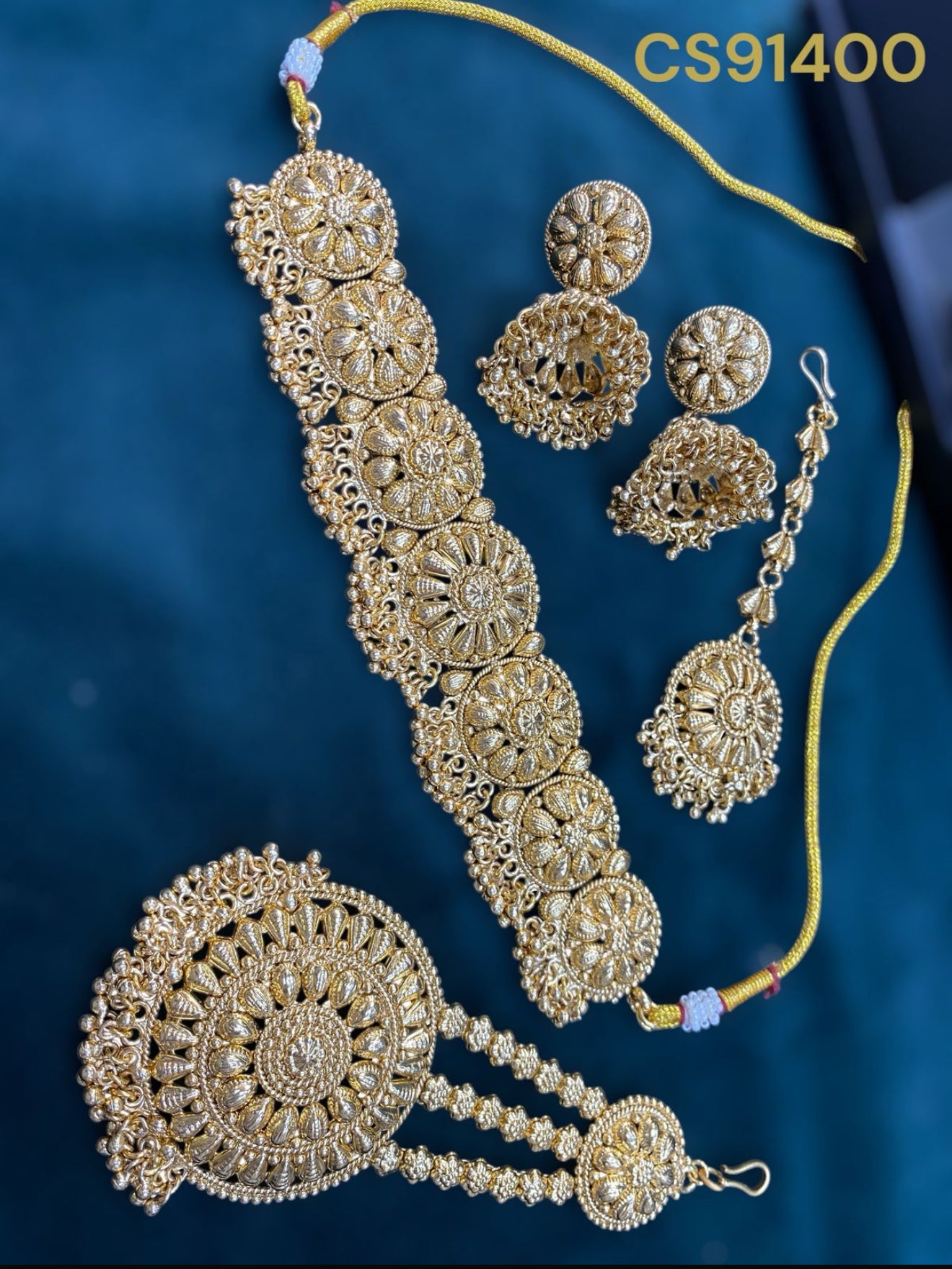 This beautiful designer gold plated necklace set features a one gram gold plated finish that gives it a real gold look. The set includes matching earrings and a tikka with passa making it the perfect accessory for any formal occasion. Elevate your style with this elegant and affordable set.