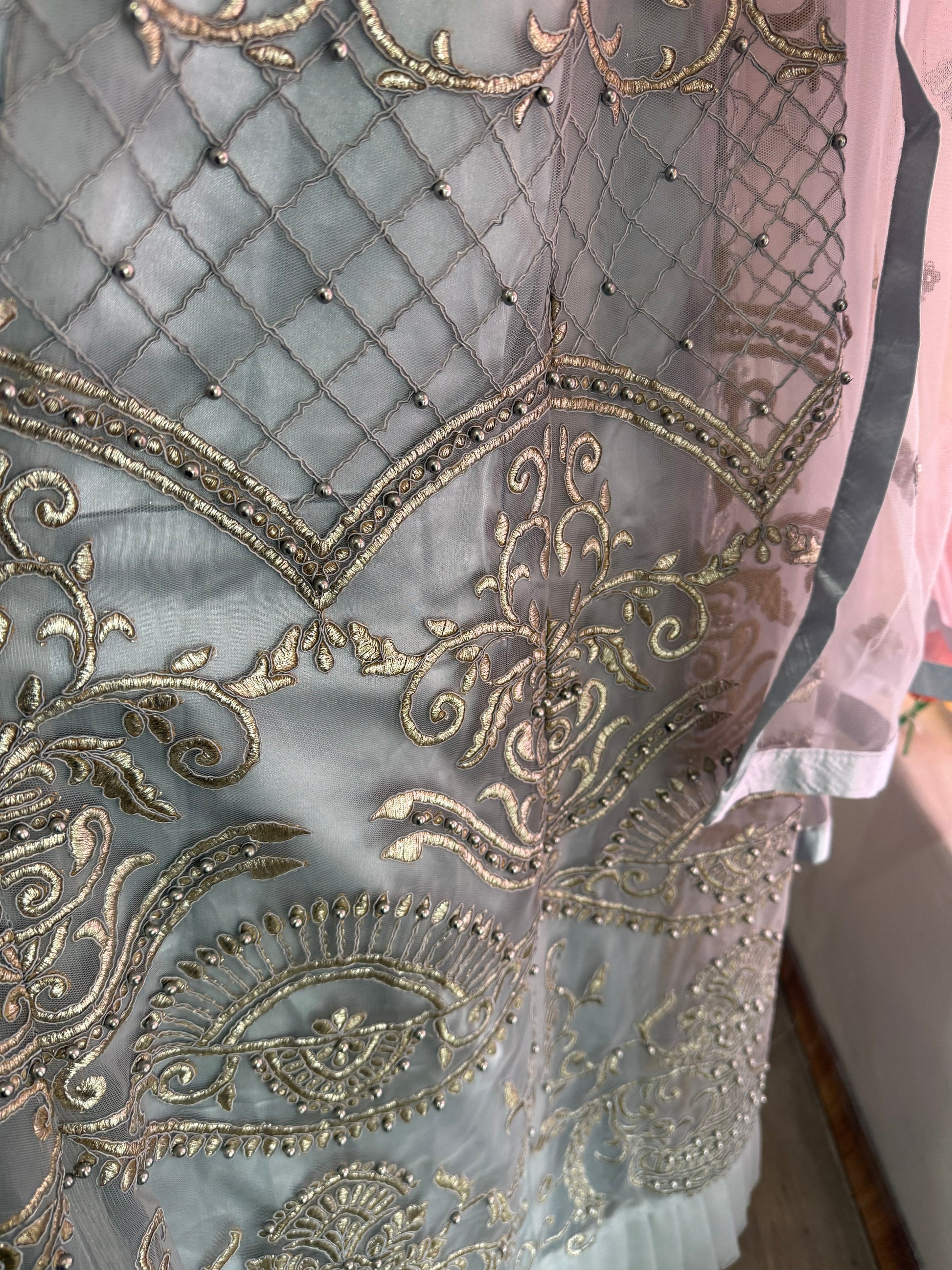 This beautiful designer anarkali suit features a lightweight net fabric with exquisite gotta embroidery on the front and back. Its elegant gown style is perfect for any ethnic occasion. Bottom not included.