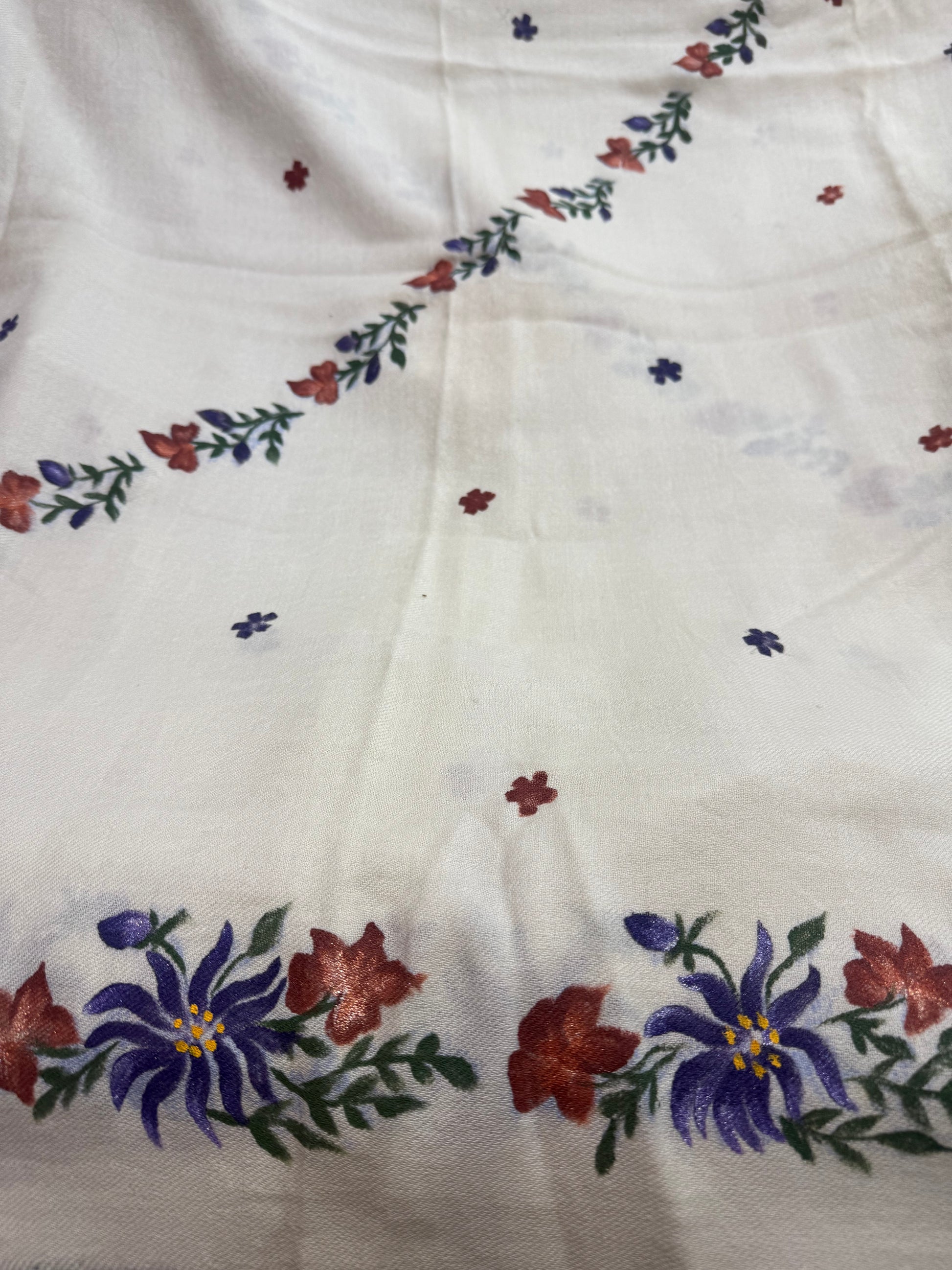 This elegant designer hand printed shawl is crafted from soft woolen pashmina fabric, offering both warmth and style. The beautiful white color adds a touch of sophistication, while its ethnic Indian design adds a unique charm. Perfect for any occasion, it's a must-have for any fashion-forward individual.