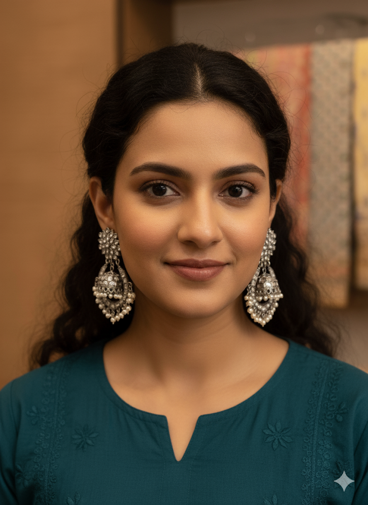 These beautiful designer oxidised earrings feature intricate jhumki detailing and elegant white beads, providing a touch of sophistication and style to any outfit. Made from high-quality materials, these earrings are a must-have for any fashion-forward individual looking to elevate their accessory game.