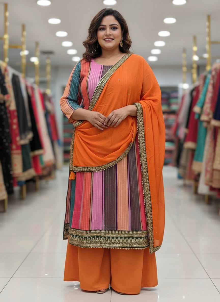 The Beautiful Designer Pakistani Plazo Suit features high-quality georgette fabric, renowned for its lightweight and breathable properties. This ethnic attire offers comfort and elegance, making it suitable for various occasions. Georgette's durability ensures longevity, while its drape enhances the overall silhouette, providing a flattering fit.