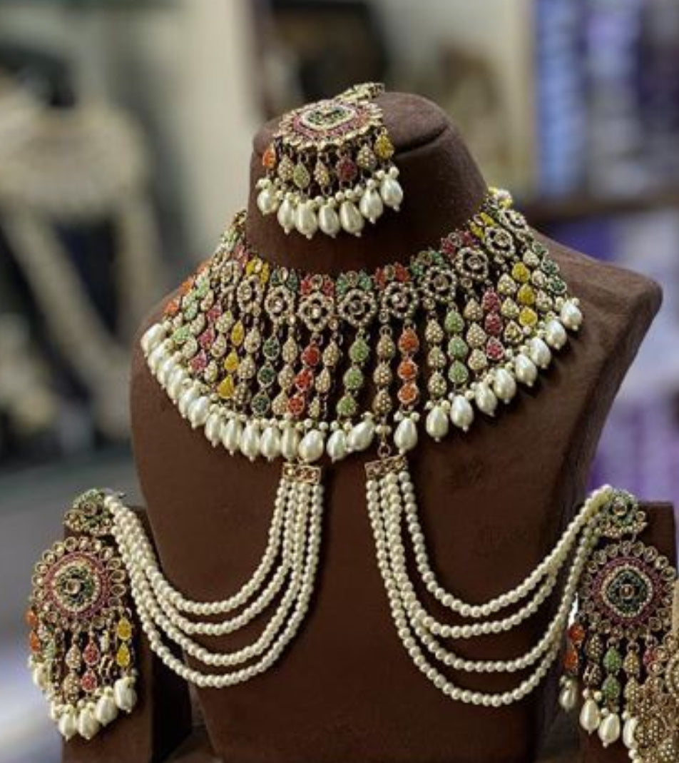 Enhance your look with our beautiful designer Pakistani style necklace set. This ethnic set is expertly crafted to add a touch of elegance to your outfit. Embrace your cultural heritage with this stunning accessory.
