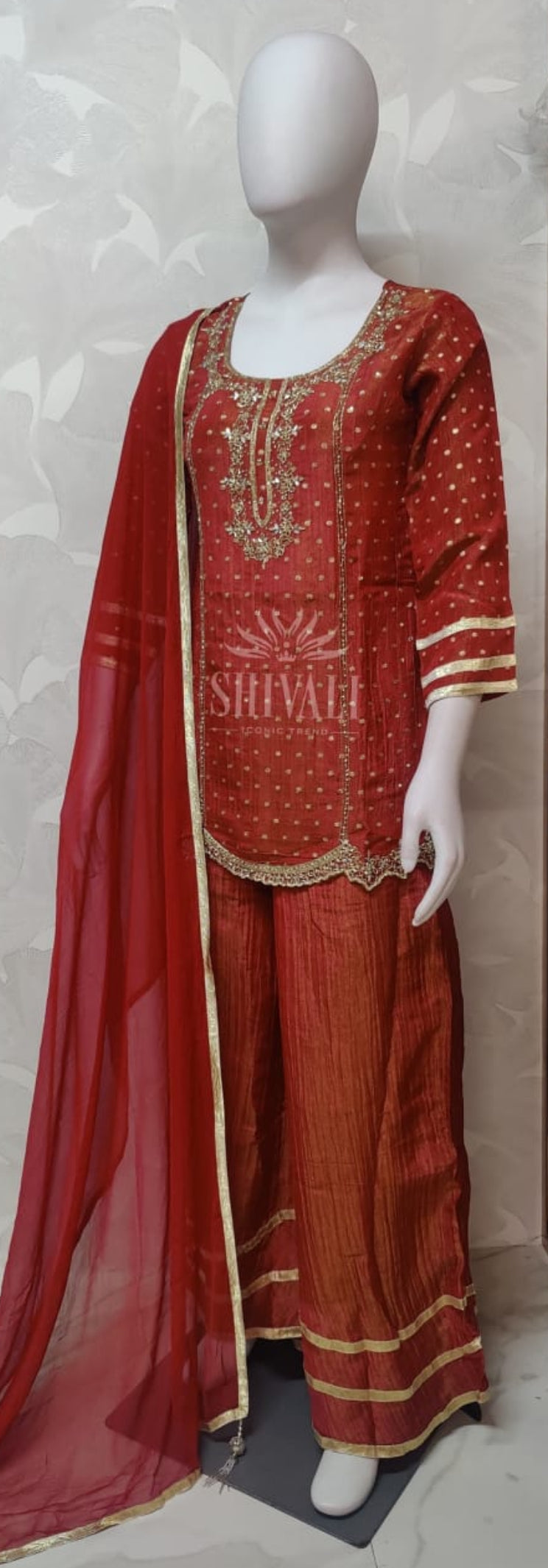 Crafted from luxurious silk, this beautiful designer plazo suit elevates any ethnic ensemble. The fabric's silky smooth texture not only adds a touch of elegance, but also ensures comfortable wear. Perfect for special occasions, this suit effortlessly combines style and comfort.