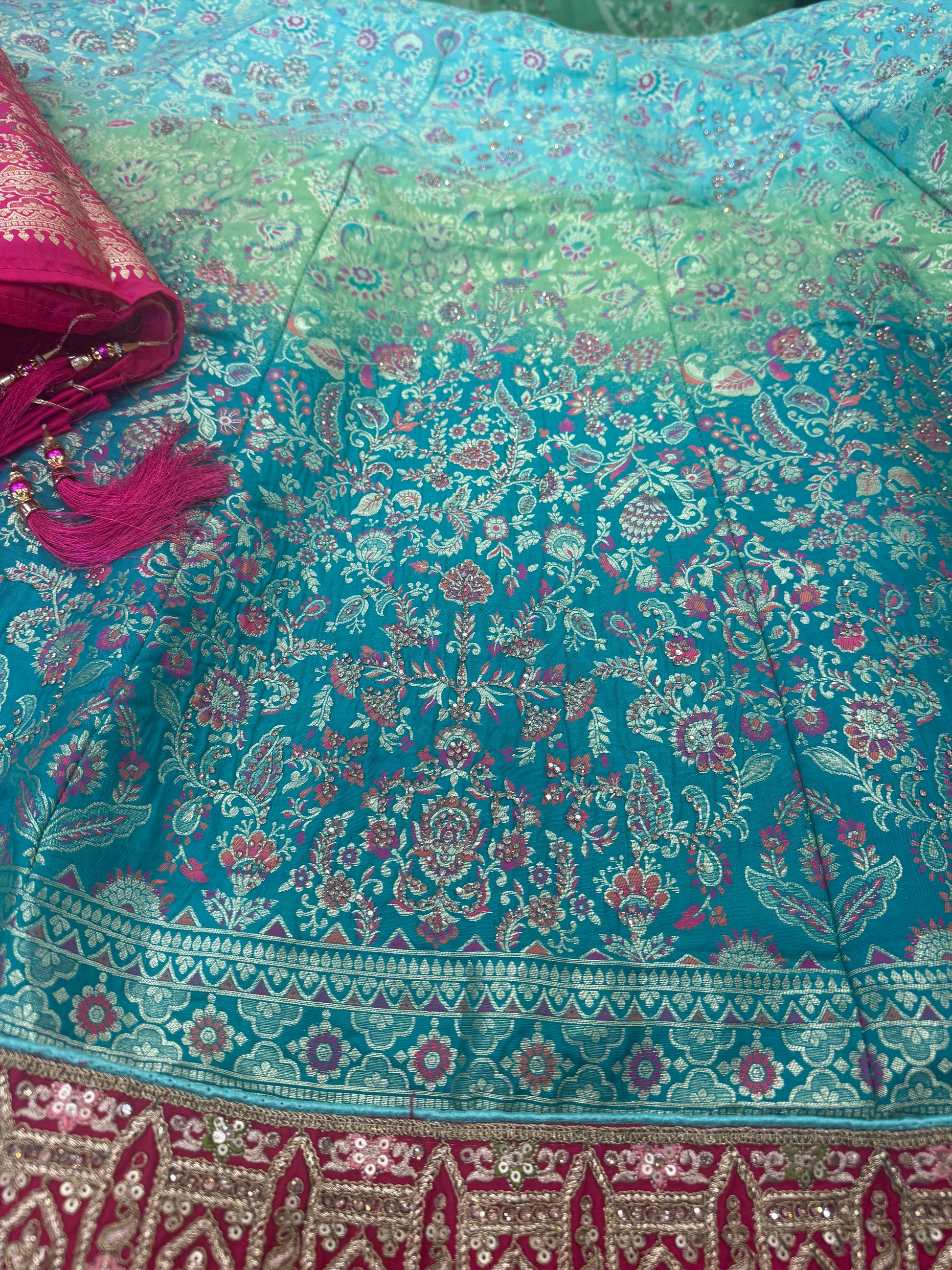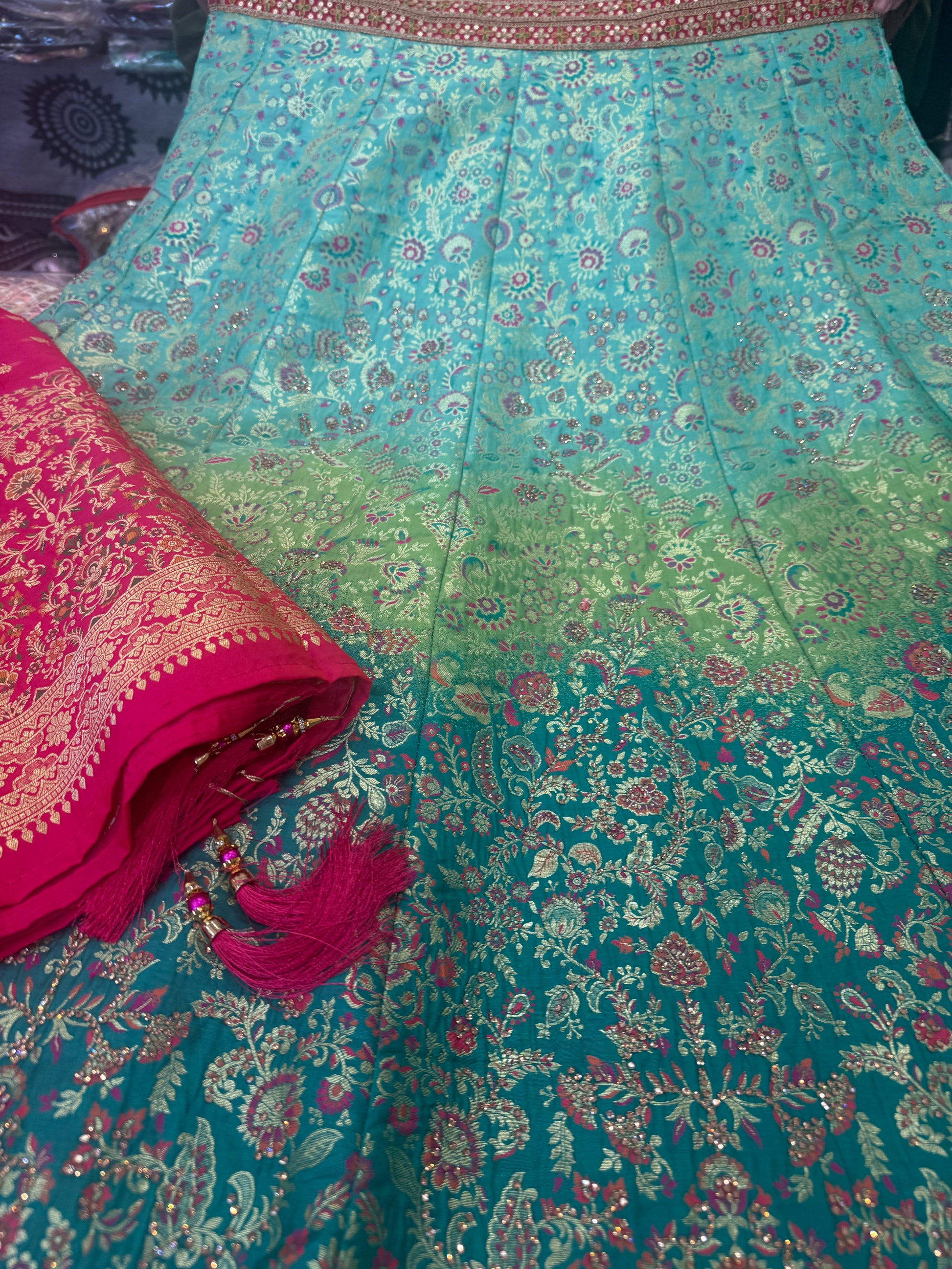 Crafted with the finest ethnic pure silk, this designer semi stitch lengha can be customized up to size 50. Elevate your style with this luxurious and versatile piece.