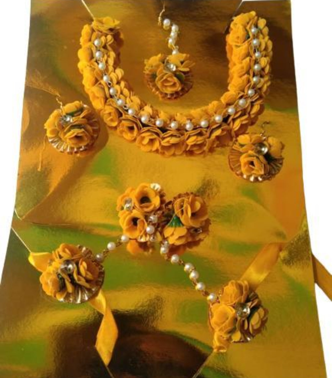 This elegant Designer Synthetic Rose Floral Necklace Set includes a necklace, earrings, hand accessories , and a maang tikka. Made with care, this set exudes timeless beauty and charm, perfect for formal occasions or everyday wear. Enhance your style and make a statement with this exquisite set.